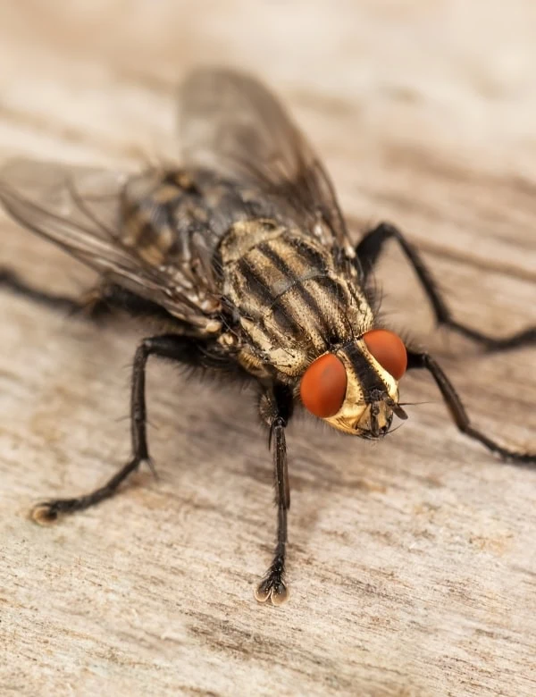 ภาพระยะใกล้ของแมลงบิน สื่อถึงบริการป้องกันและกำจัดแมลงวันและแมลงหวี่ในอาคารและสถานประกอบการ